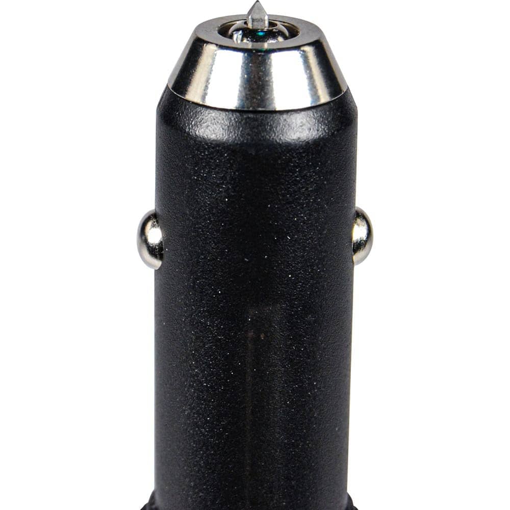The window breaker shatters side windows for escape from submerged or crashed vehicles. The seatbelt cutter slices through jammed belt fabric when buckles fail. Two tools that can save your life in crash scenarios.